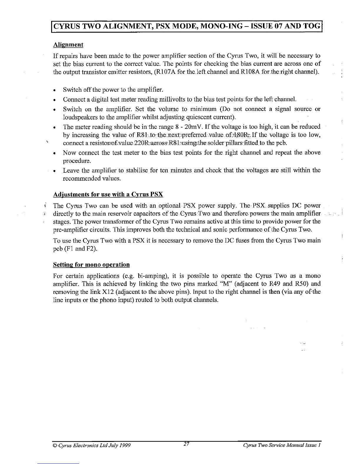 Cyrus Two - Cyrus Two Alignment, PSX Mode, Mono-Ing - Issue 07 and TOG; Adjustments for Use with a Cyrus PSX; Setting for Mono Operation