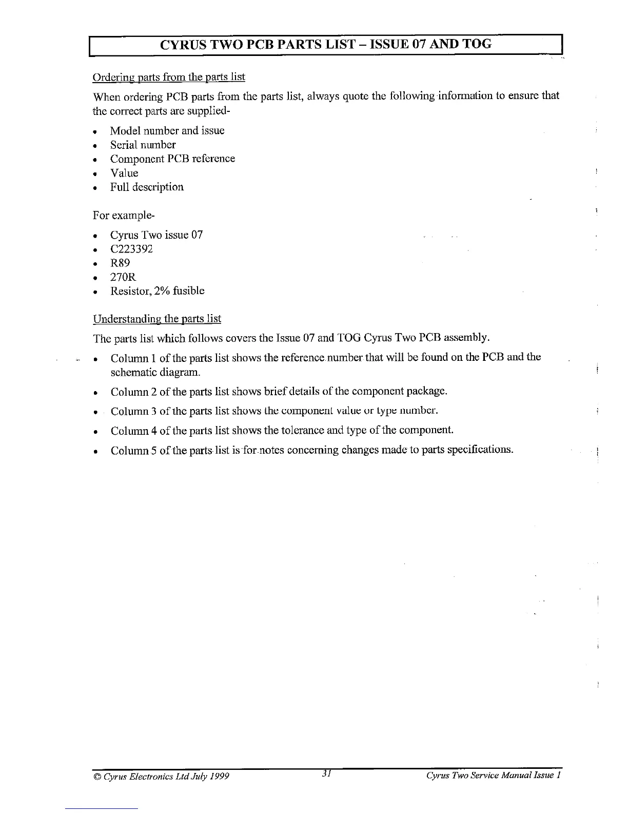 Cyrus Two - Cyrus Two PCB Parts List - Issue 07 and TOG