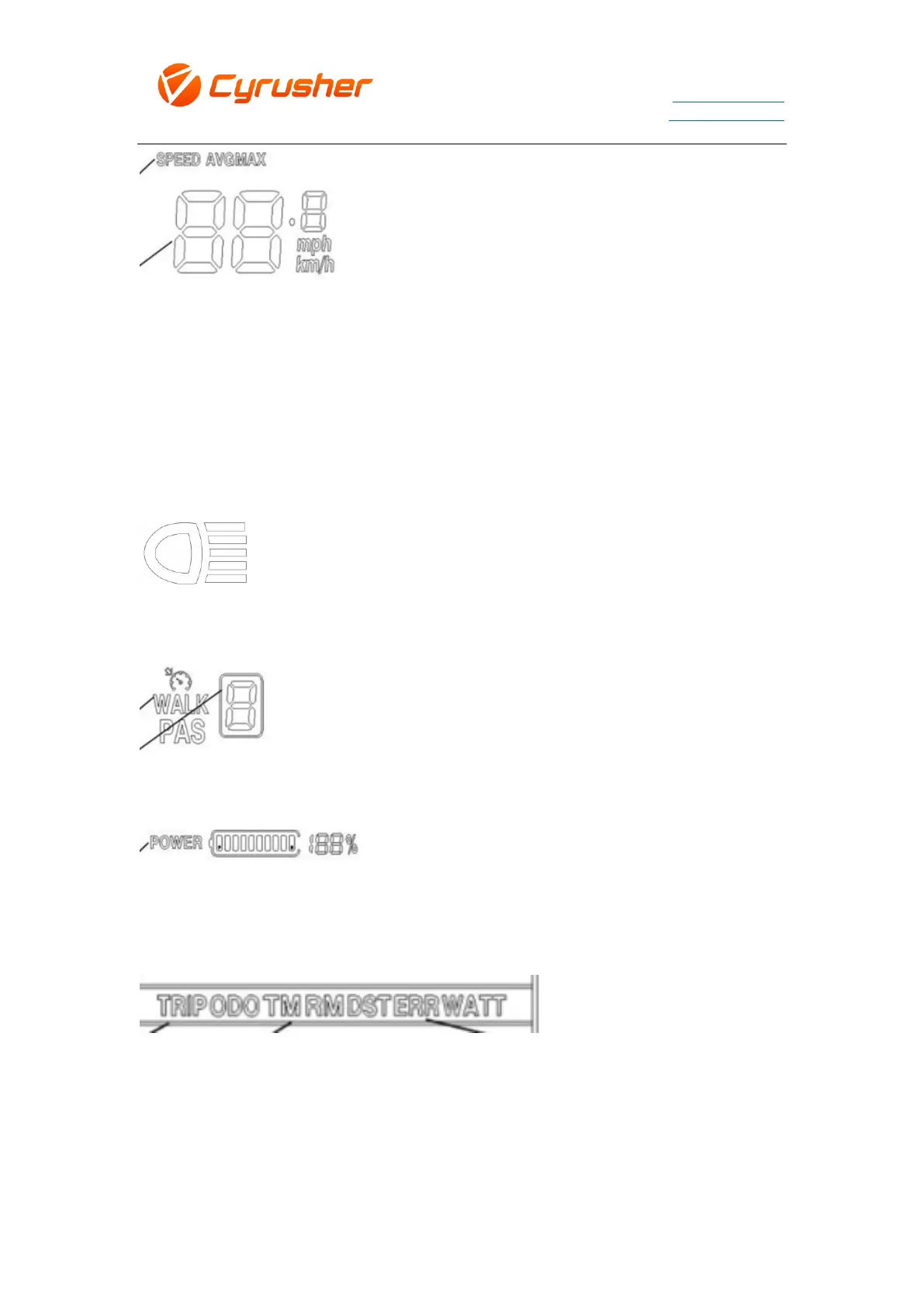 Cyrusher S700 - Speed and Mileage Indicators; Control and Status Symbols