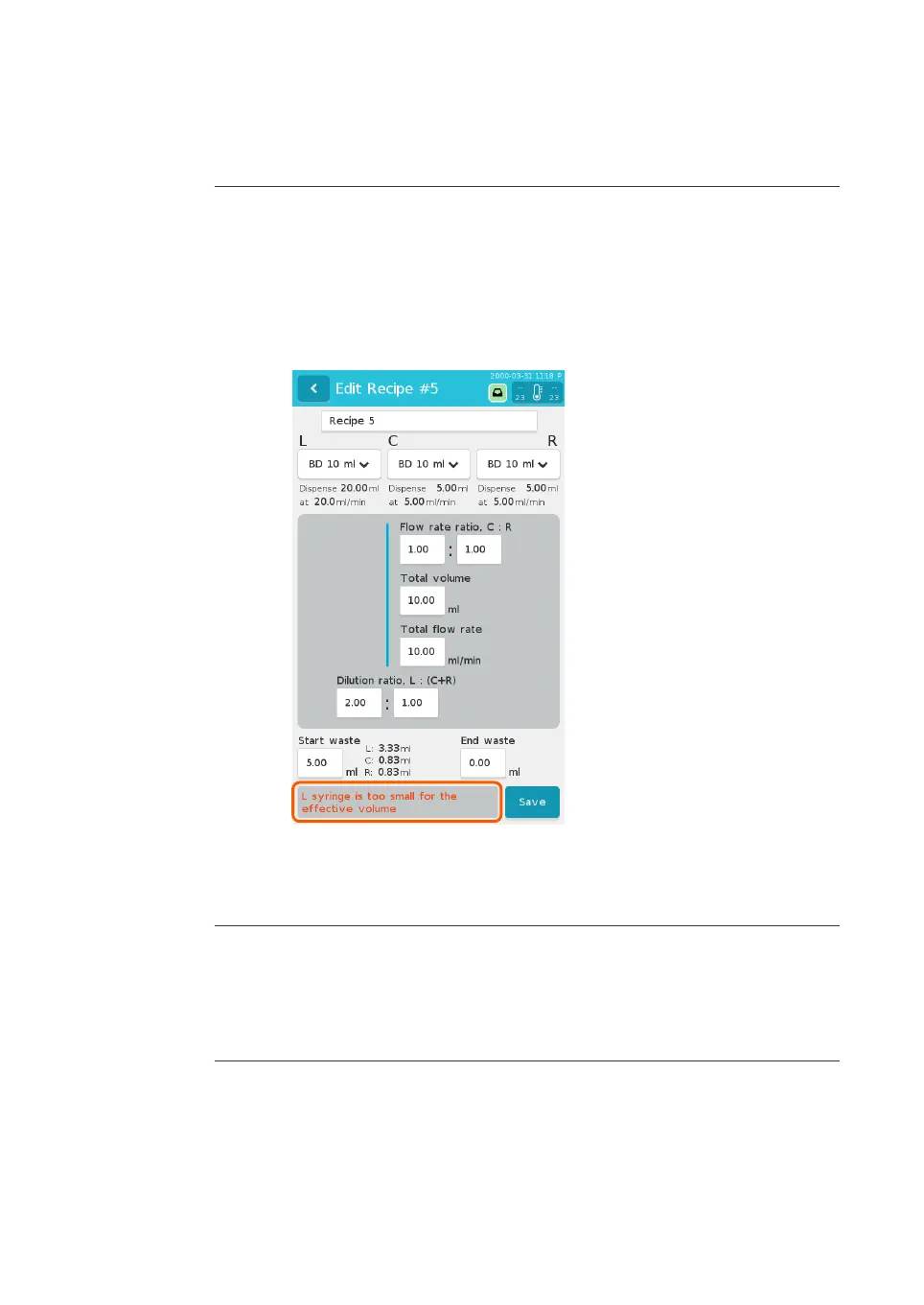 waste for each syringe is displayed to the right of the Start waste field.