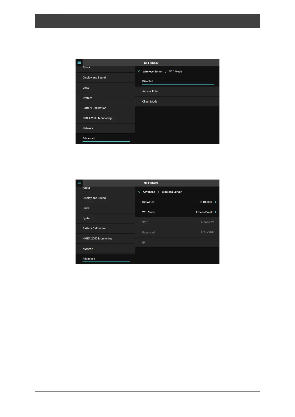 4. If Access Point is enabled the WiFi SSID and password will be shown per below image. Use