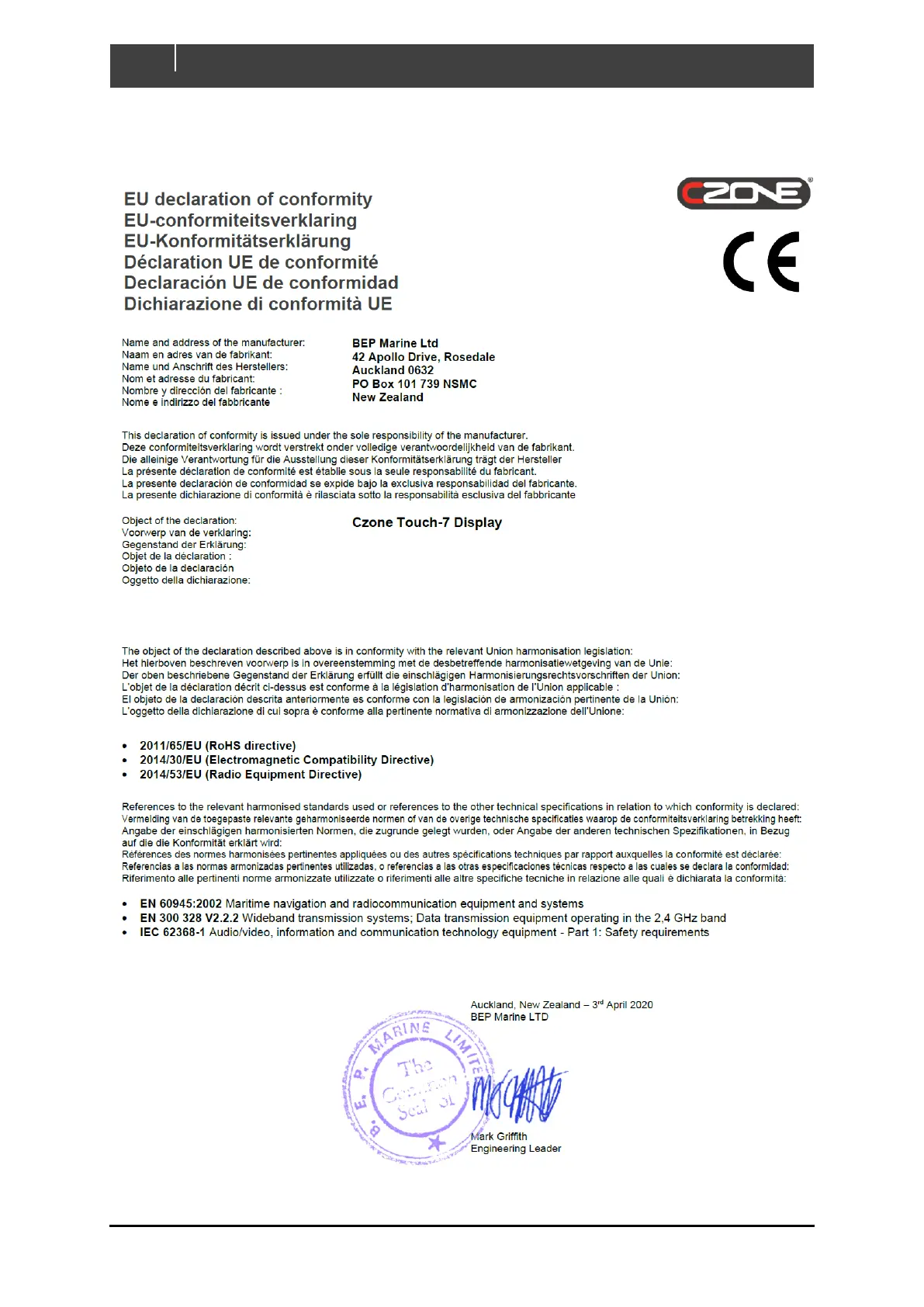 CZone Touch 7 - 7 EC Declaration of Conformity; EU Declaration of Conformity Details; Manufacturer Information