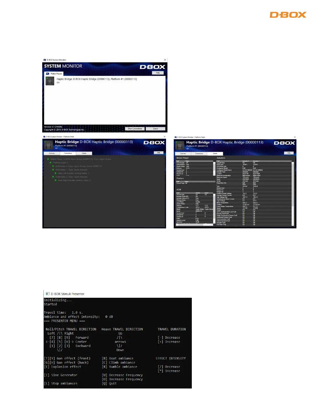 The D-BOX Stimuli Presenter is a keyboard-controlled application to send basic signals to the haptic system,