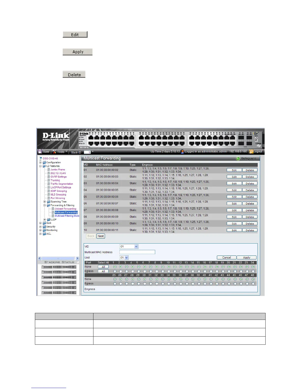 1. Click L2 Features > Forward & Filtering > Multicast Forwarding. The Multicast Forwarding Page opens: