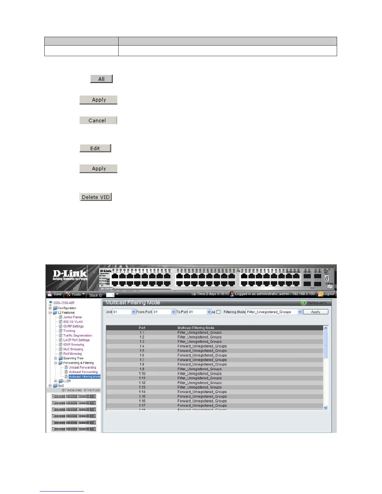 The Multicast Filtering Mode Page displays the port filtering mode for unregistered Multicast groups. Ports can filter or