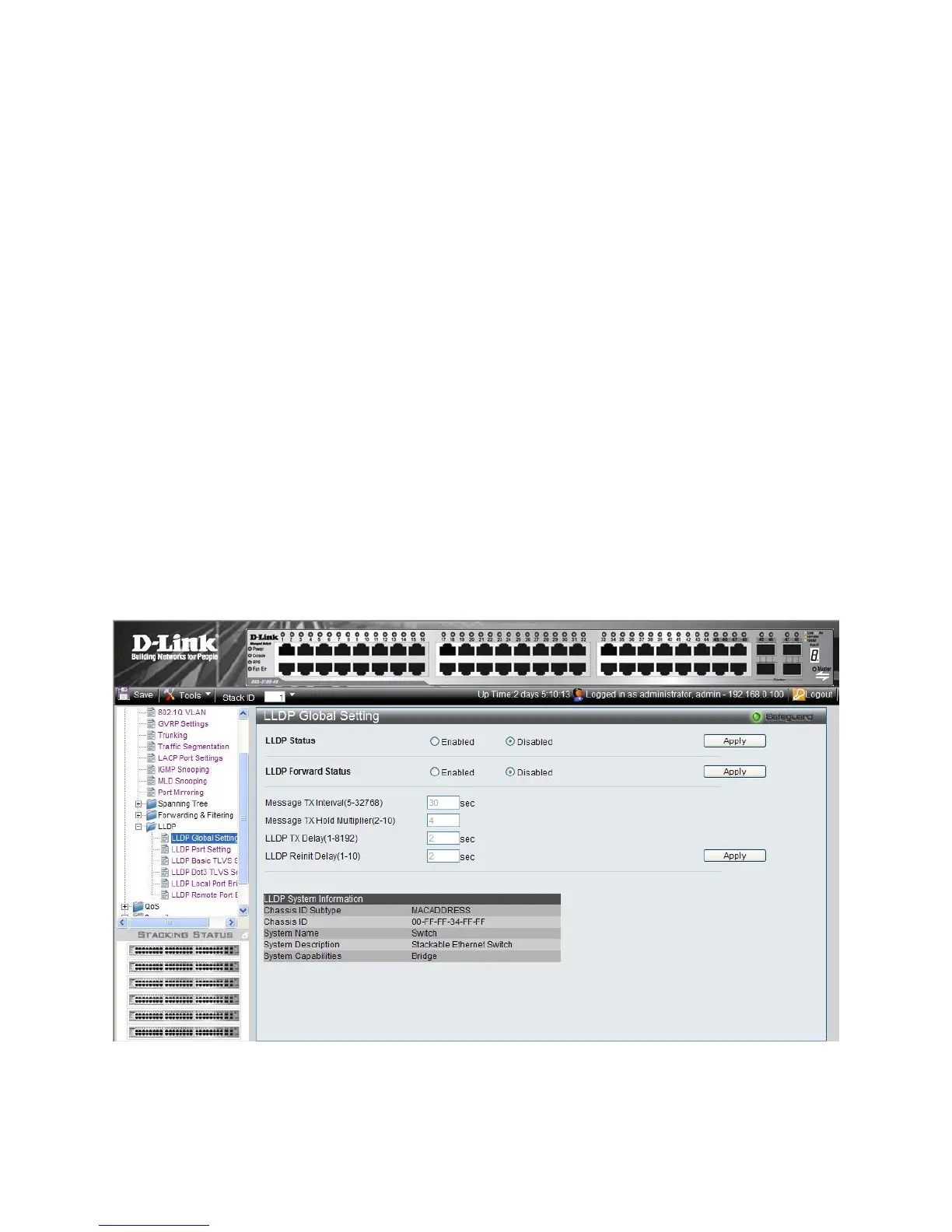 The LLDP Global Setting Page displays LLDP system information and contains parameters for configuring LLDP global