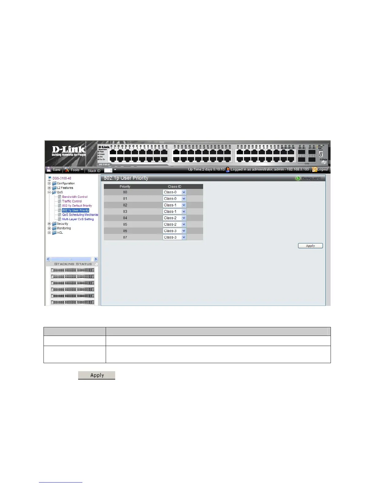 The 802.1P User Priority Page allows network managers to assign priority tags to classes (queues). If a network manager