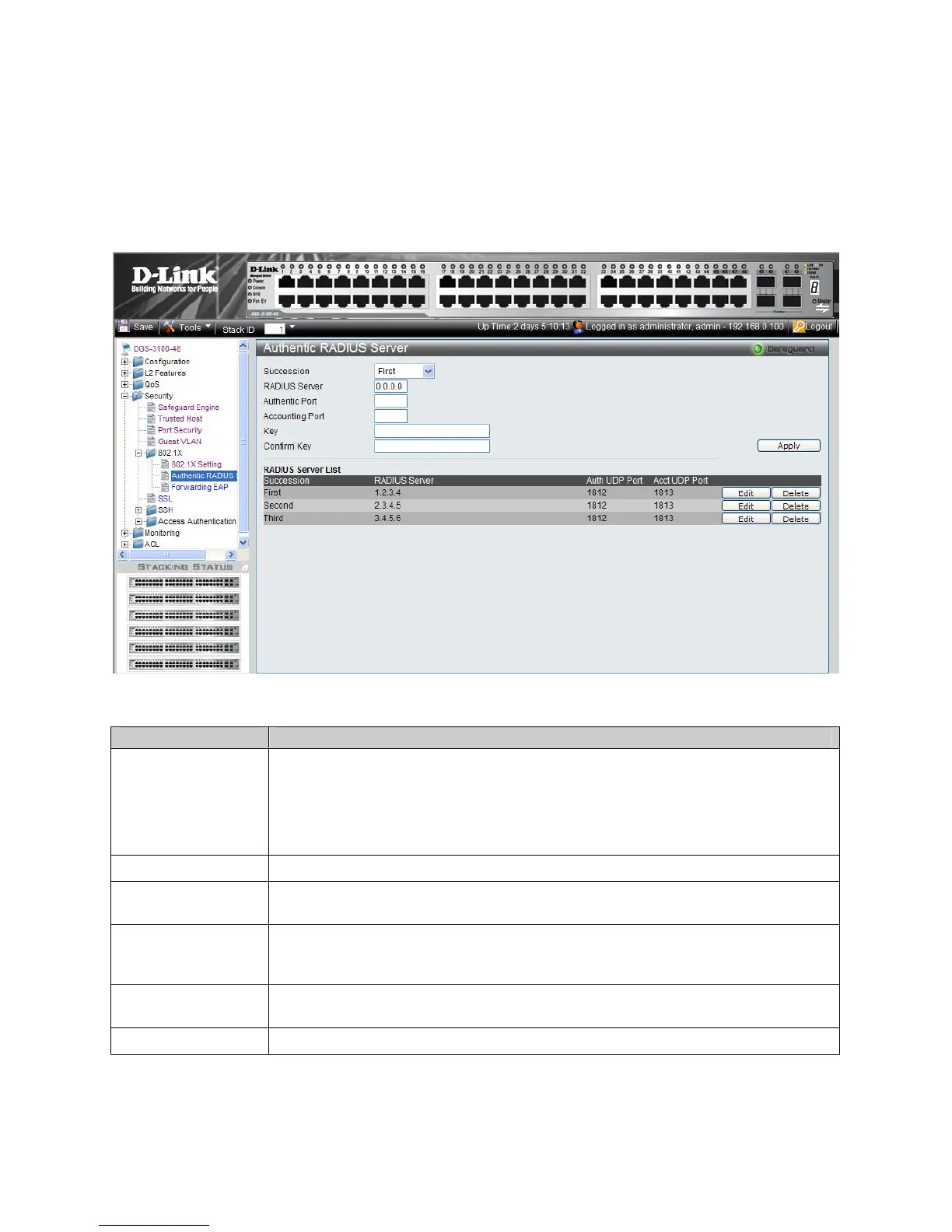 1. Click Security > 802.1X > Authentic RADIUS Server. The Authentic RADIUS Server Page opens: