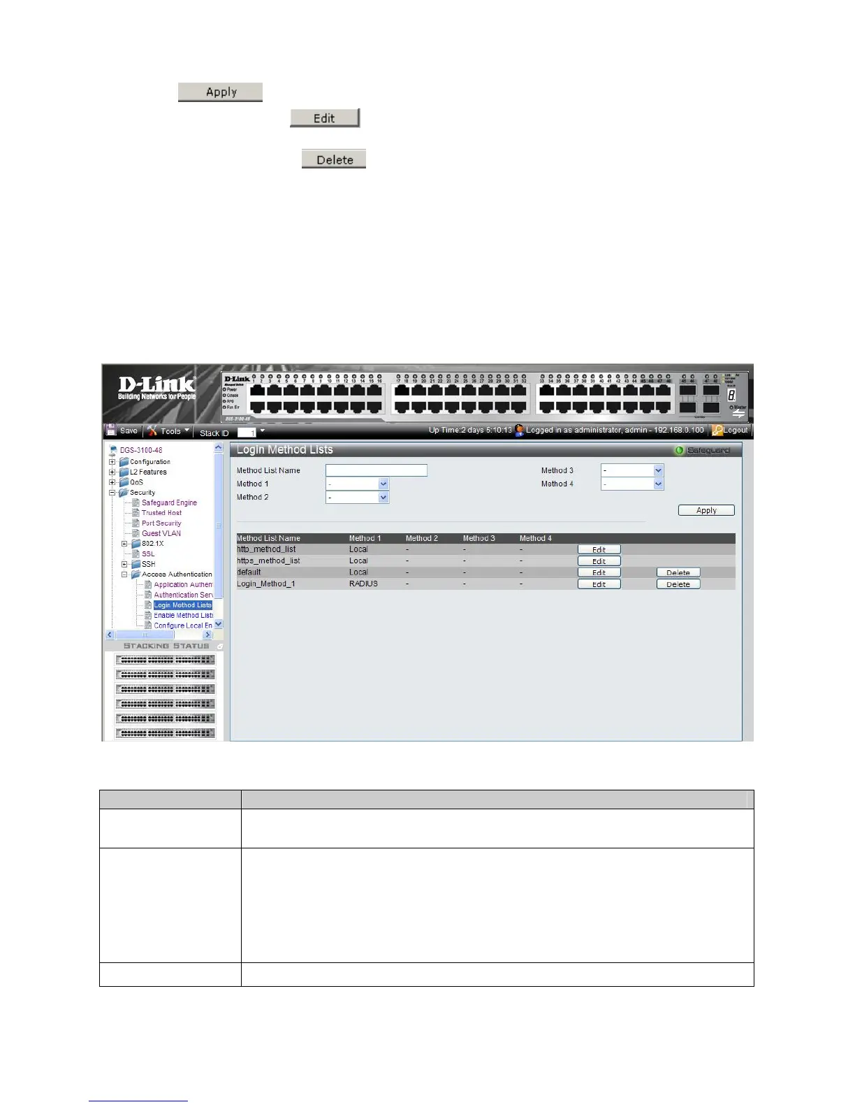 1. Click Security > Access Authentication Control > Login Method Lists. The Login Method Lists Page opens: