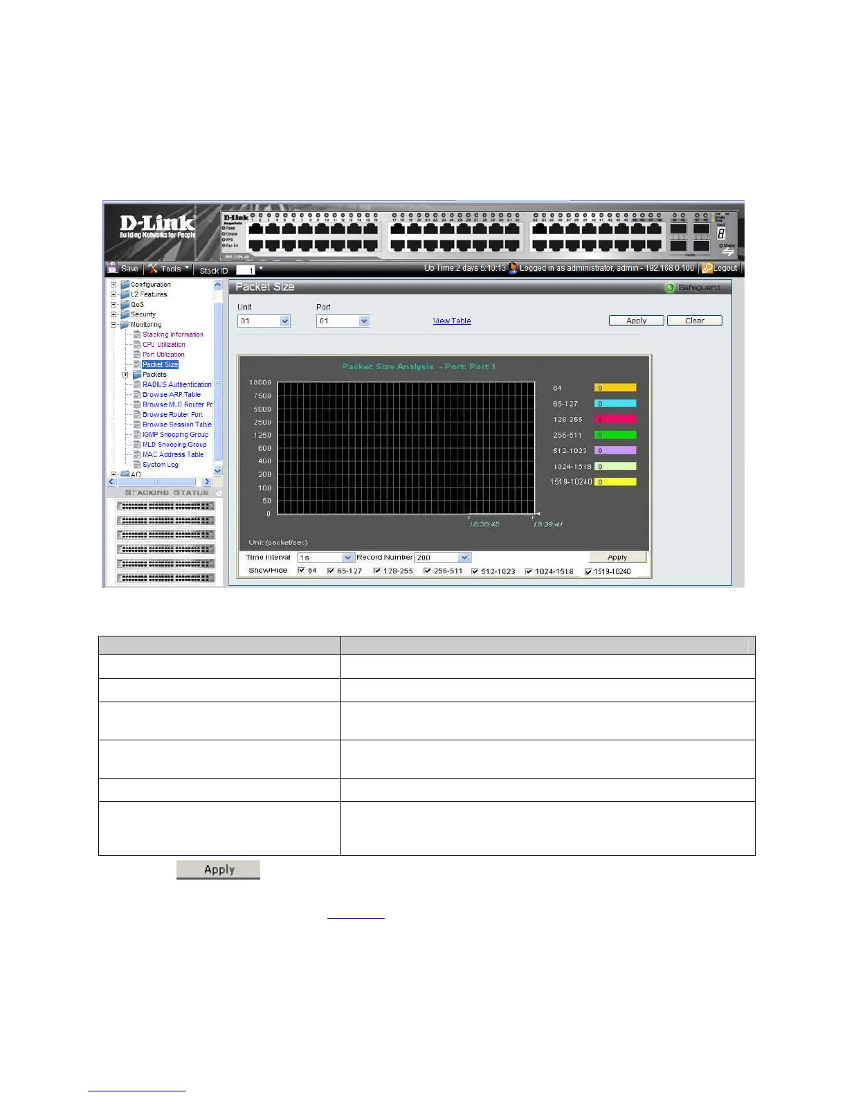 The Packet Size Page displays packets received by the switch, arranged in seven groups and classed by size, to be viewed as