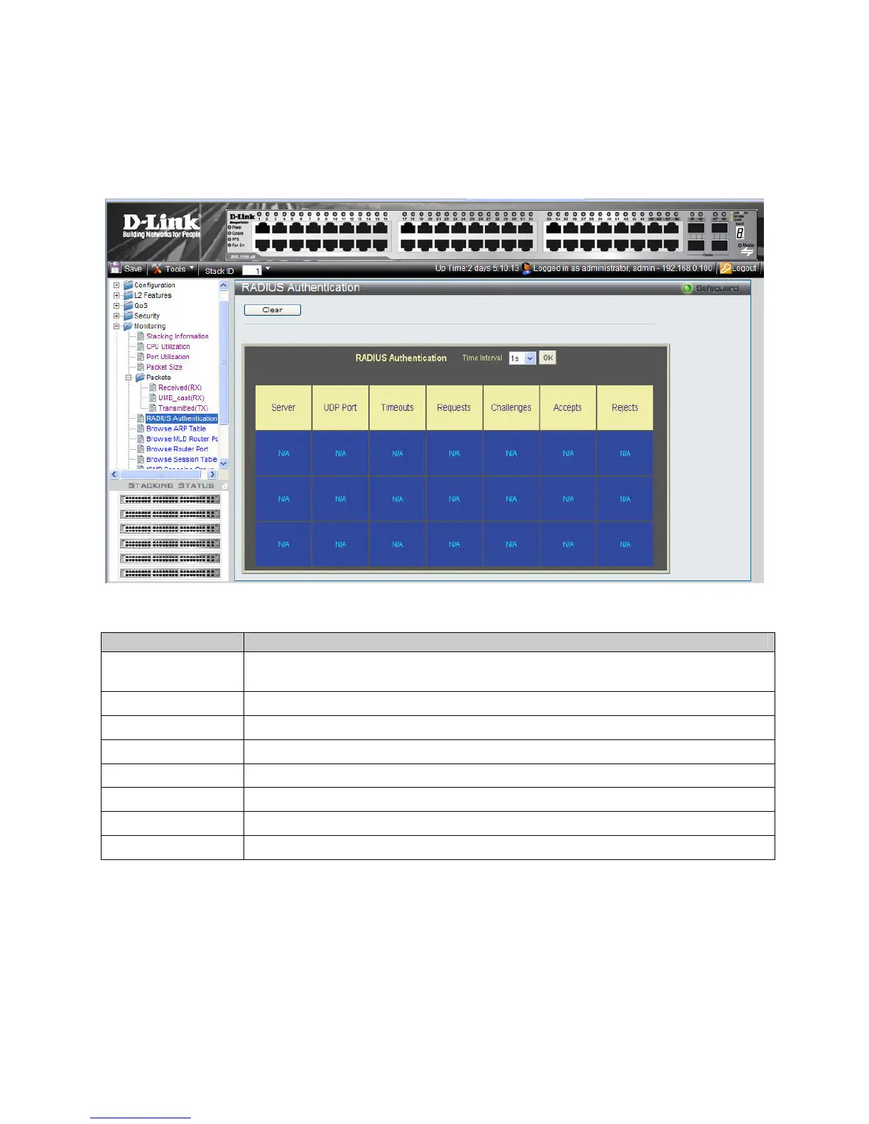 1. Click Monitoring > Port Access Control > RADIUS Authentication. The RADIUS Authentication Pageopens: