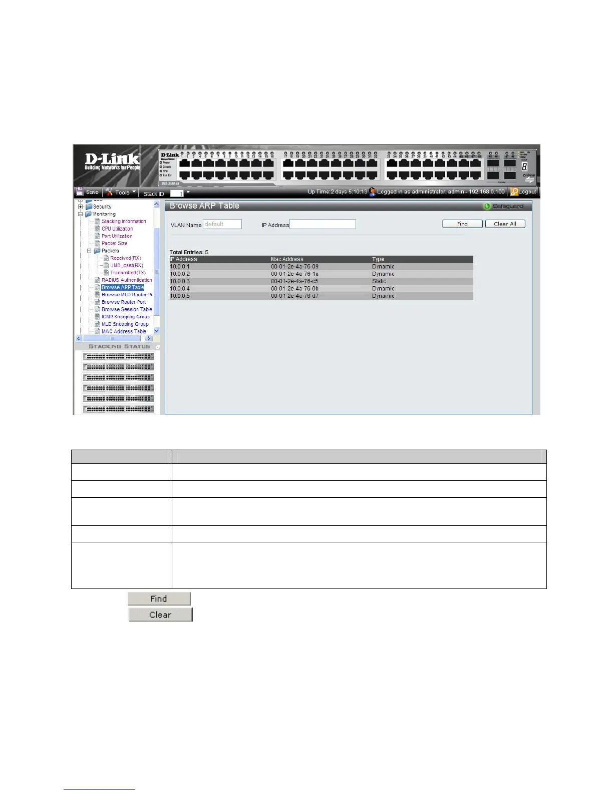1. Click Monitoring > Browse ARP Table. The Browse ARP Table Page opens: