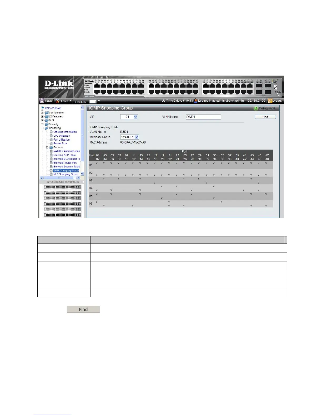 1. Click Monitoring >IGMP Snooping Group. The IGMP Snooping Group Page opens: