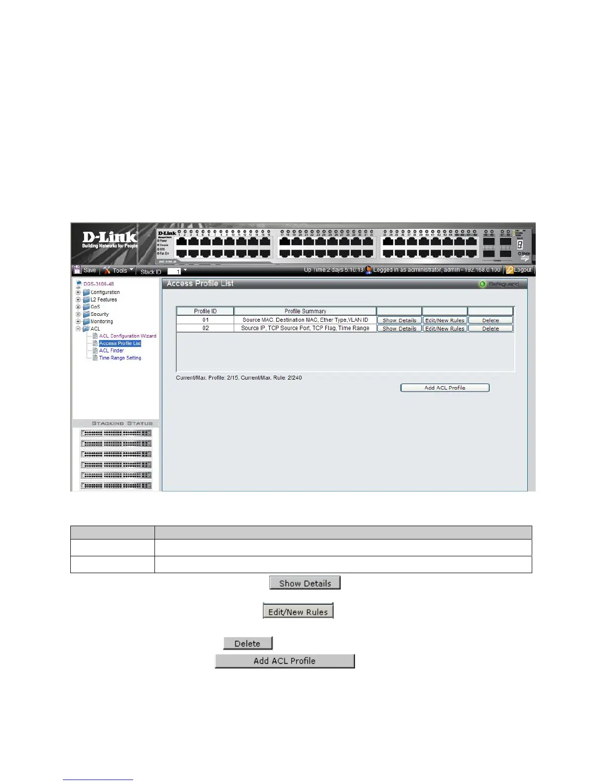 1. Click ACL > Access Profile List. The ACL Profile List Page opens: