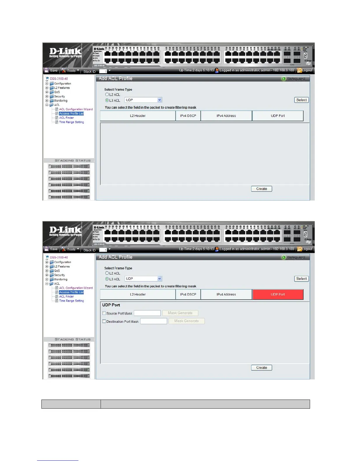 1. Click the UDP Port button. The ACL Profile L3 UDP Port Page updates to show the following: