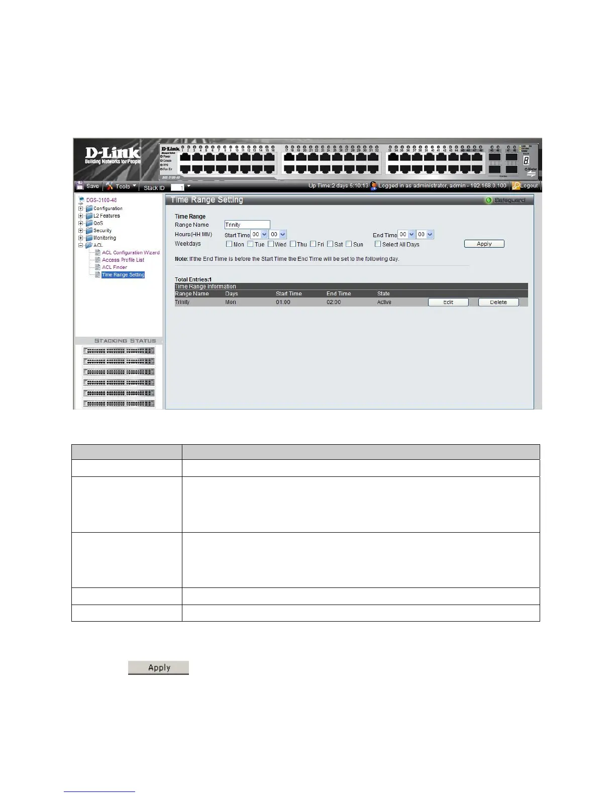 1. Click ACL > Time Range Setting. The Time Range Setting Page opens: