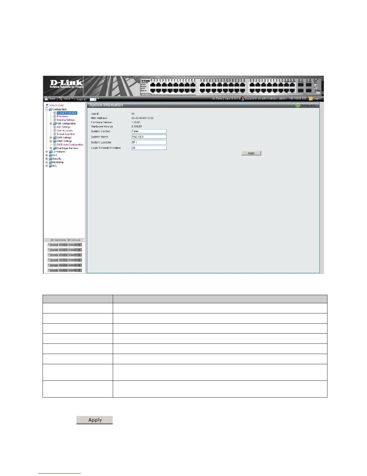 The System Information Page provides device information about specific stacking members. To view system information: