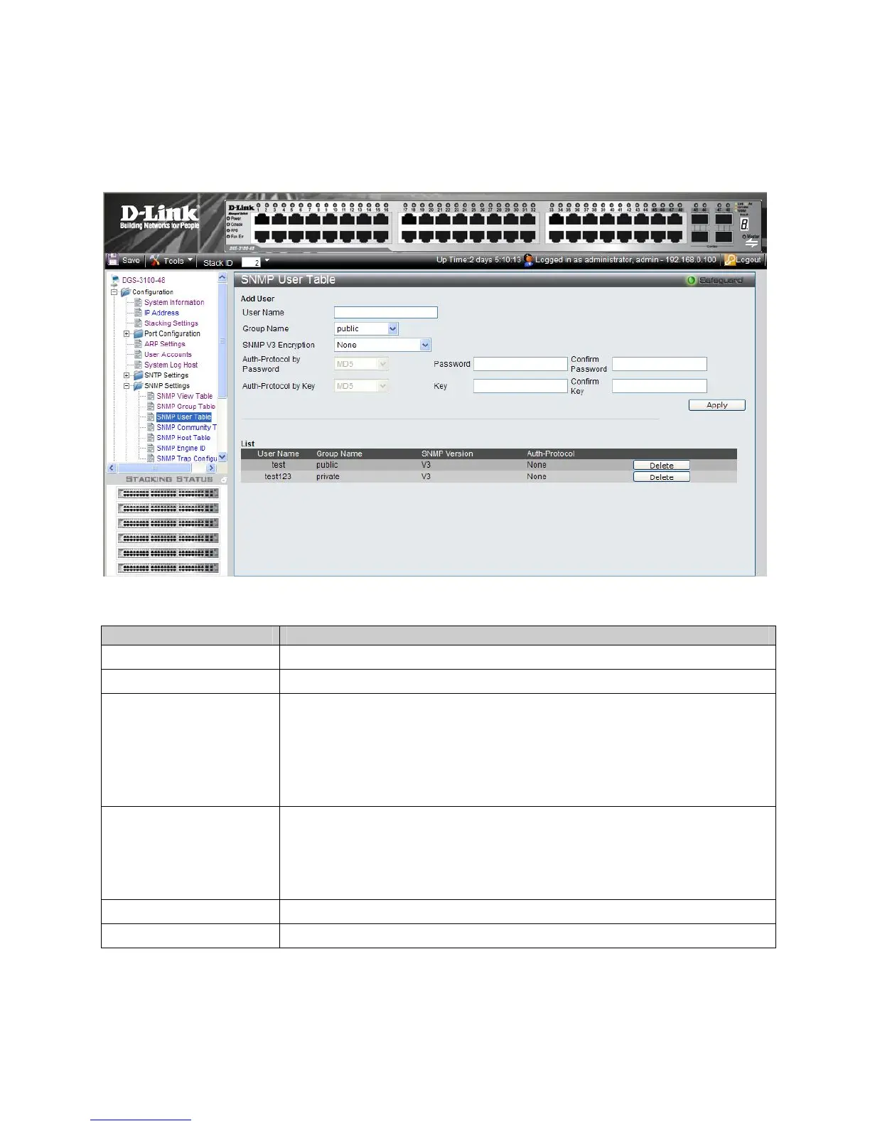 1. Click Configuration > SNMP Settings >SNMP User Table. The SNMP User Table Page ope