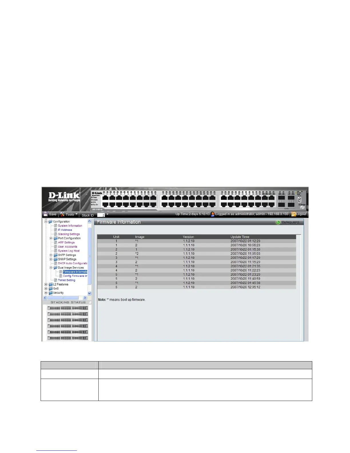 The Firmware Information Page contains information about the image files stored for the device, or in case of a stacked