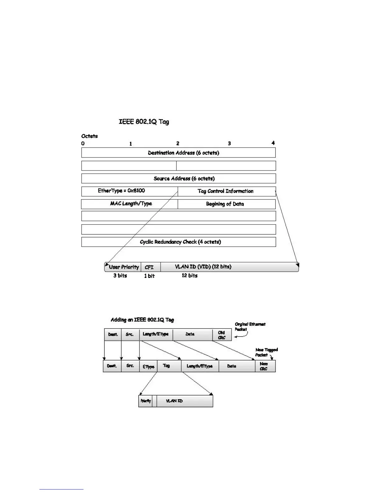 The figure below shows the 802.1Q VLAN tag. There are four additional octets inserted after the source MAC address.