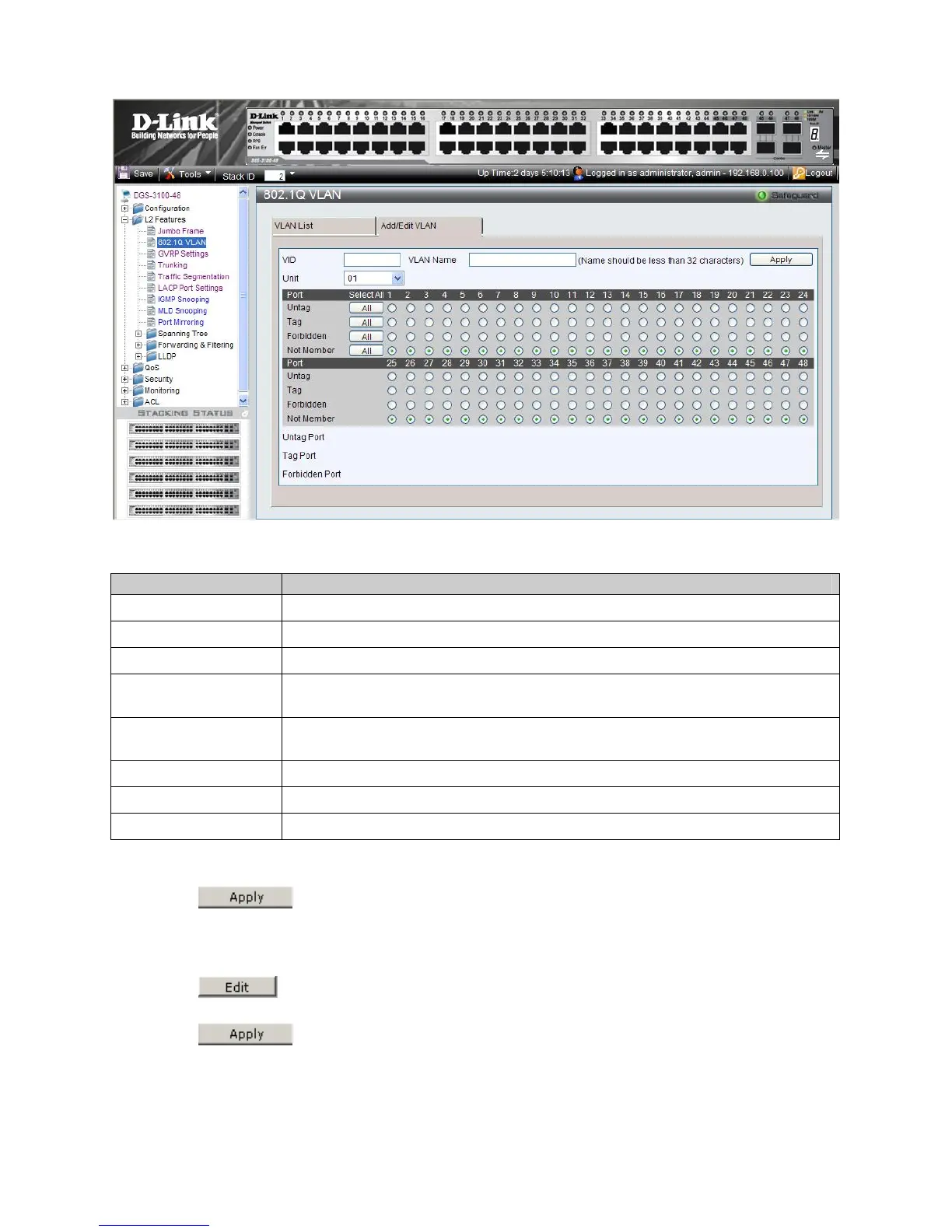 1. Click L2 Features > 802.1Q VLAN. The VLAN Configuration Page opens: