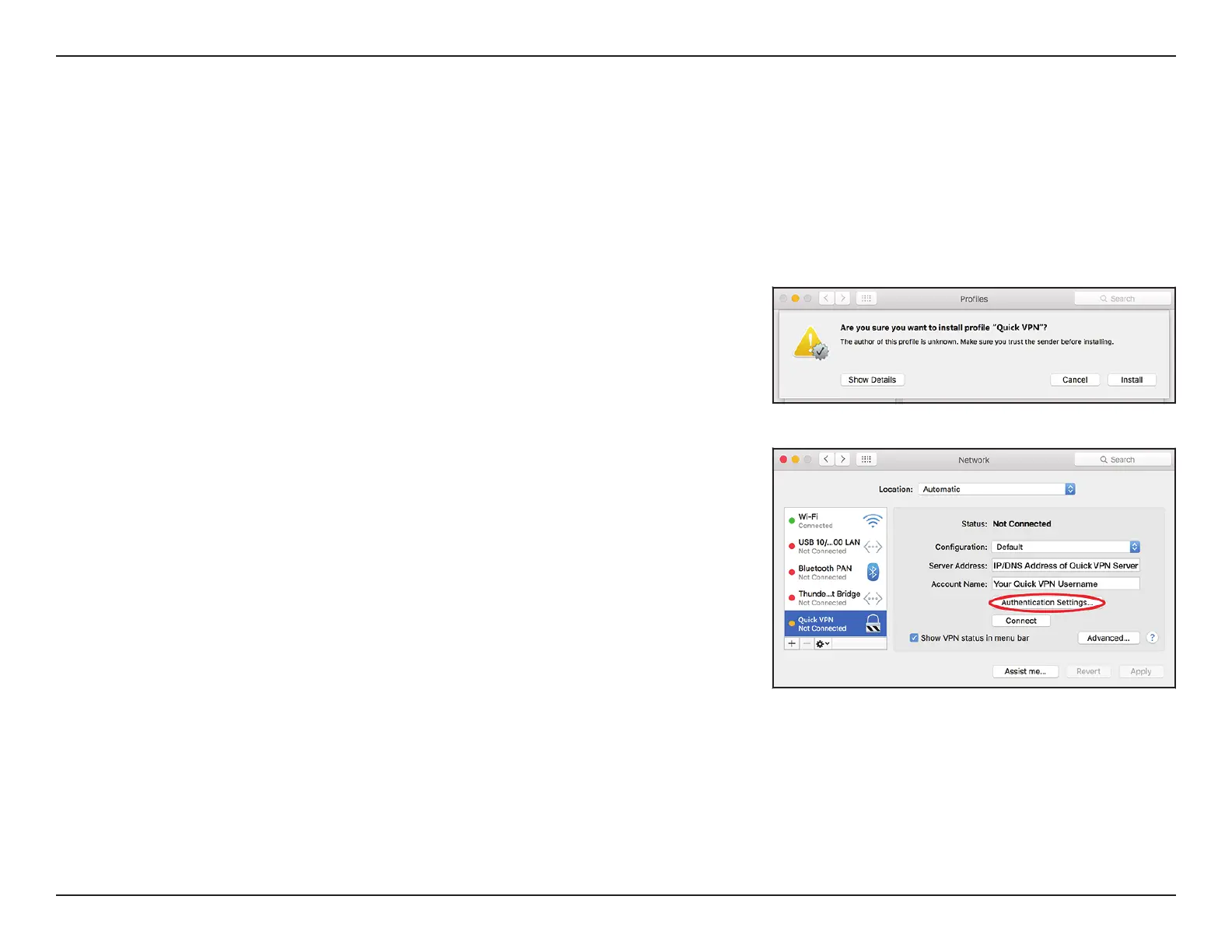 This section provides Quick VPN setup instructions for OS X using the Export Prole function. Refer to Quick VPN on page