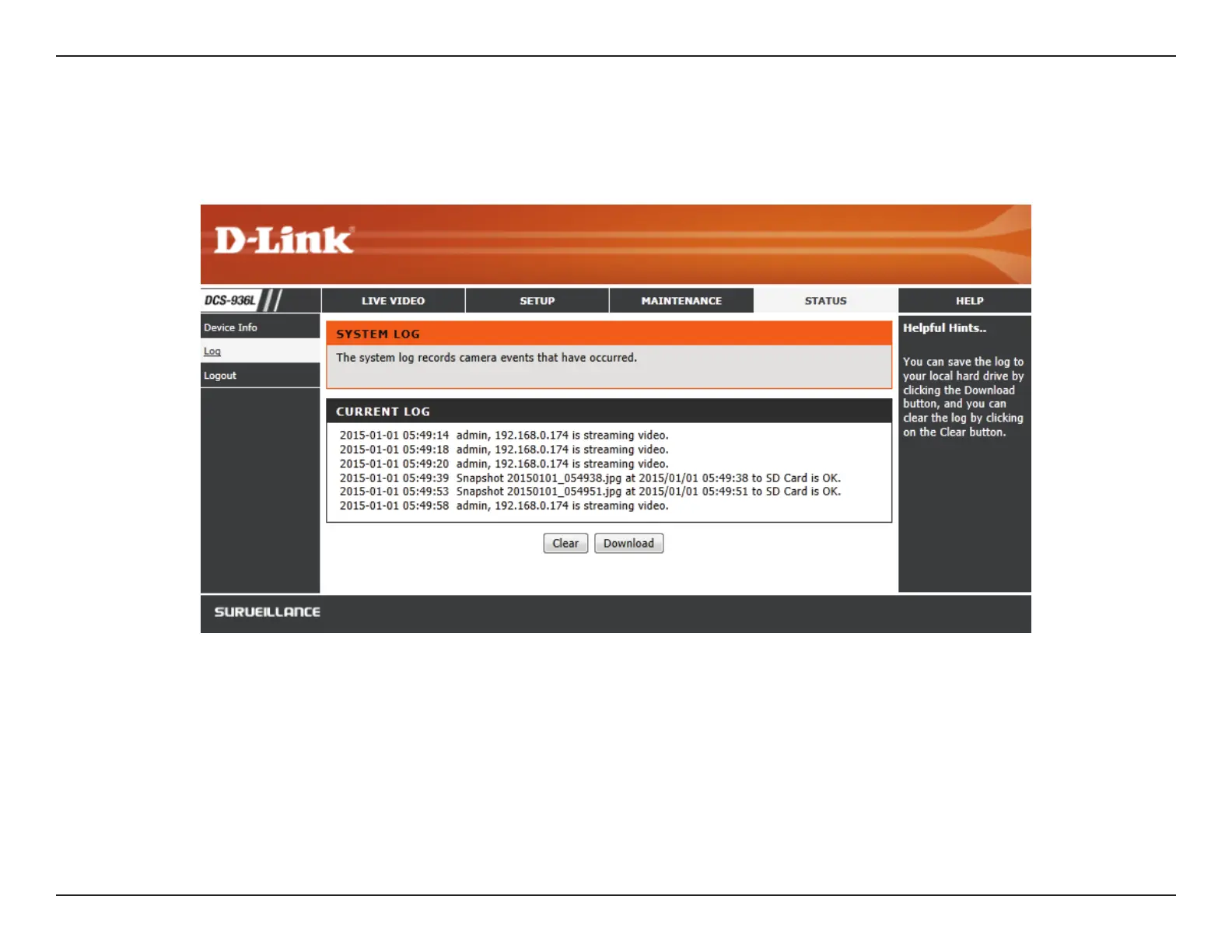 This page displays the log information of your camera. You may download the information by clicking Download. You may also click Clear to delete