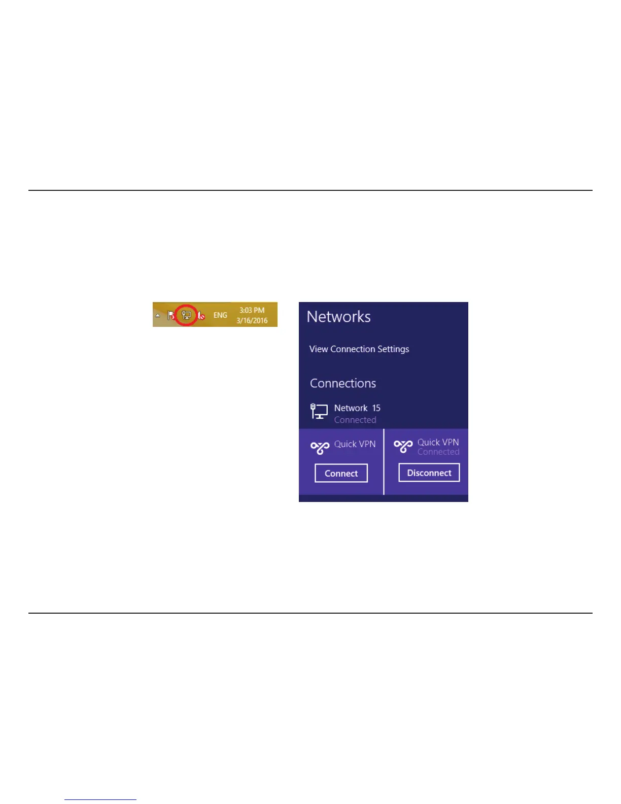 To connect to or disconnect from your Quick VPN server, click on the Network Settings icon in the notication area of the Windows taskbar. Click