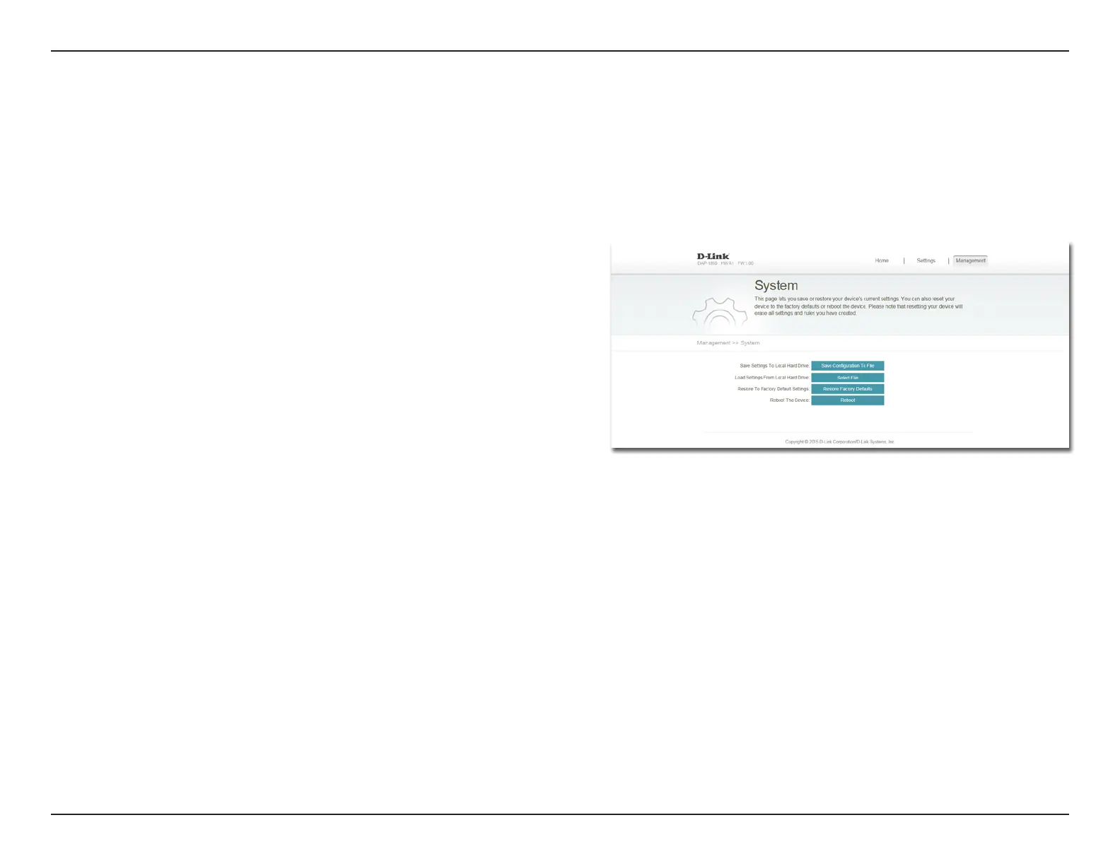 This page allows you to save or restore your system conguration, reset, or reboot the DAP-1860. To access this page, click the