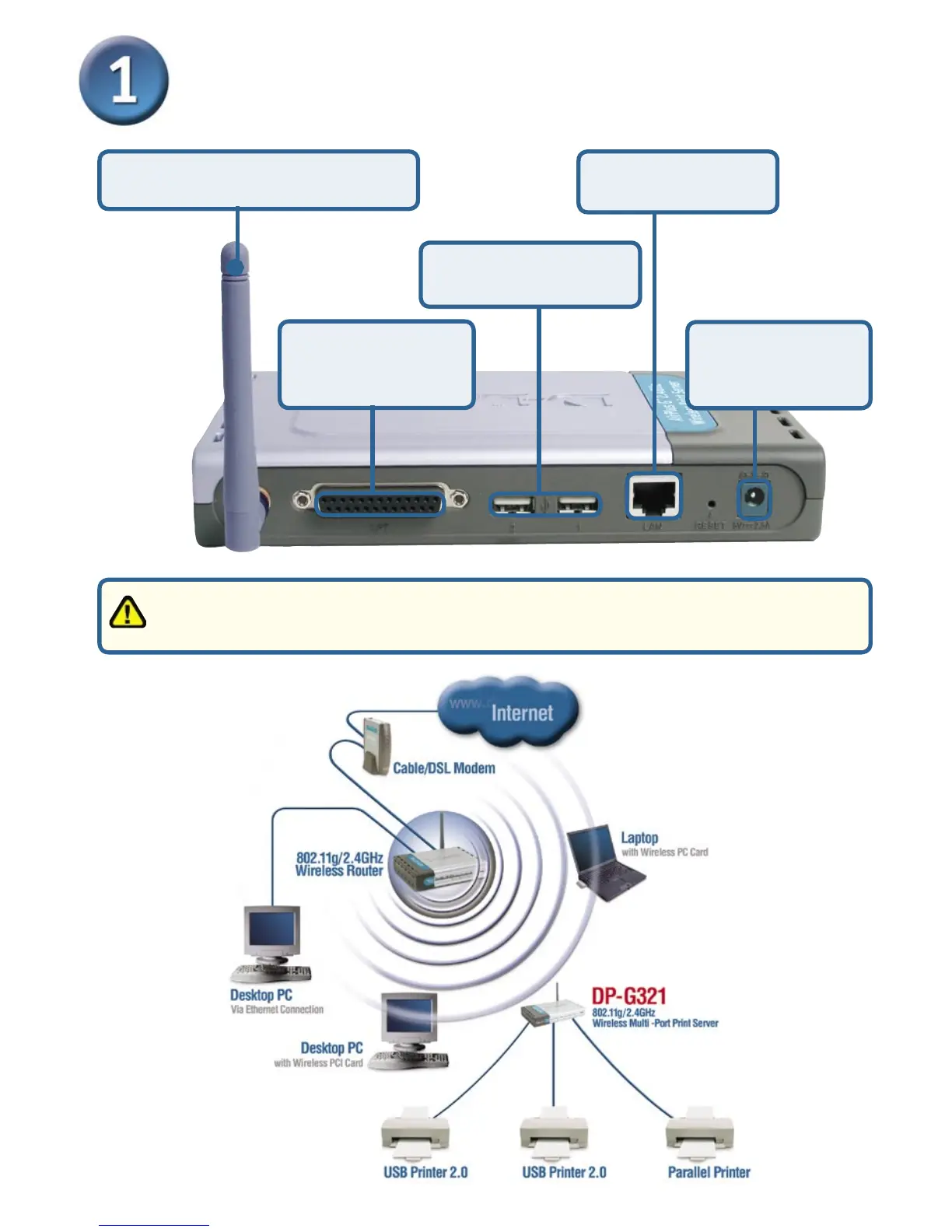 Only attach USB printers to the USB ports of the DP-G321. Do not connect any other USB device