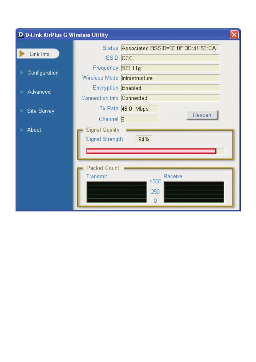 • Packet Count: Graphically displays the statistics of data transmitted and received.