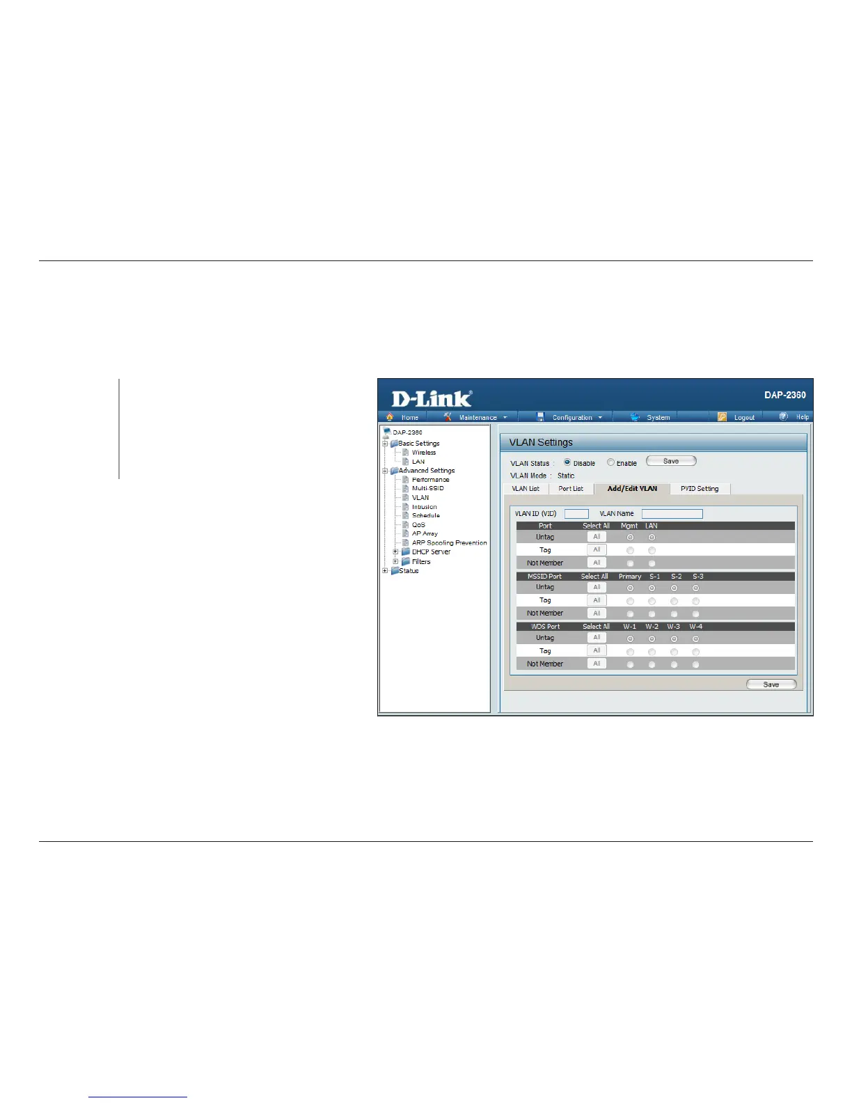 The Add/Edit VLAN tab is used to congure VLANs. Once you have made the desired changes, click the Save button