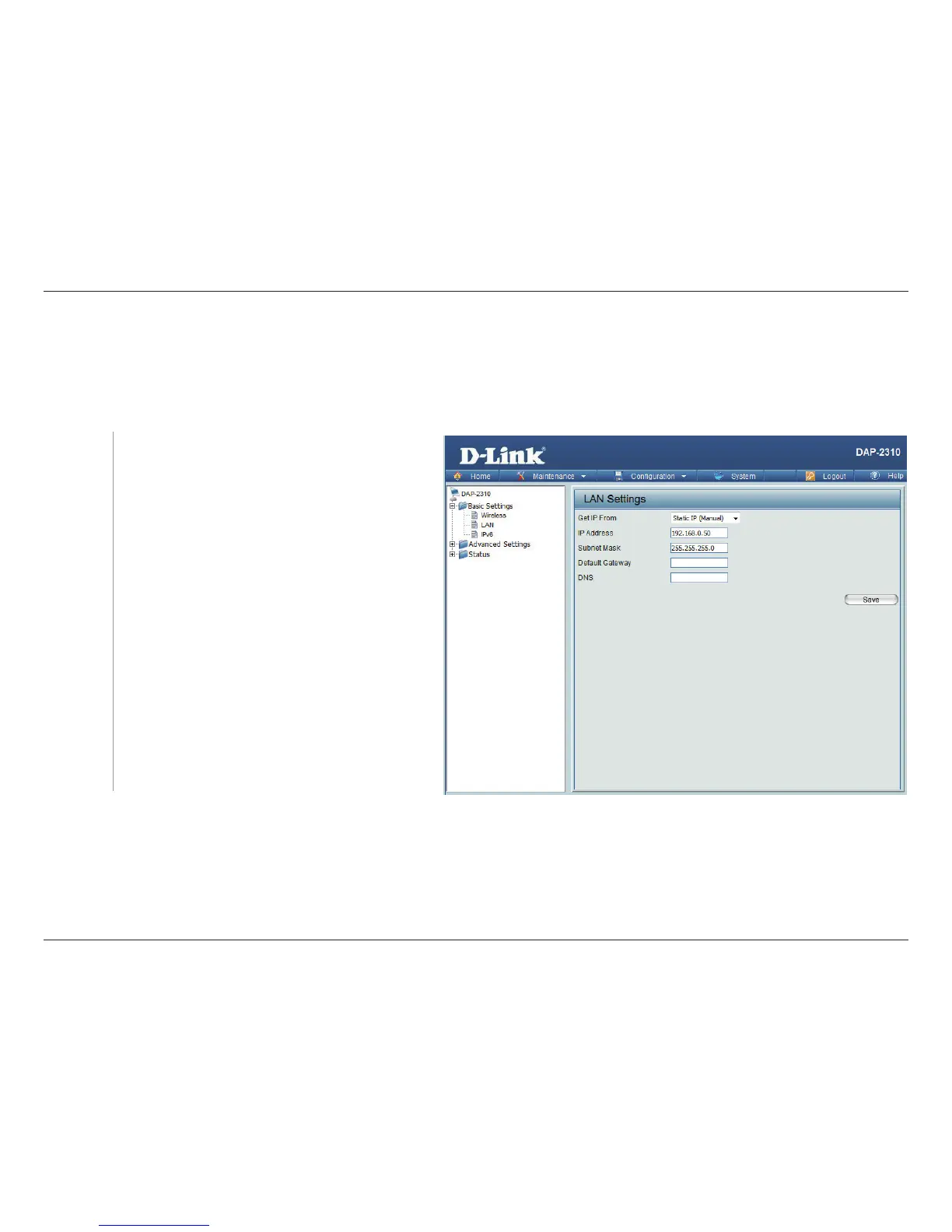 the DAP-2310. These settings may be referred to as private settings. You may change the LAN IP address if needed. The LAN IP