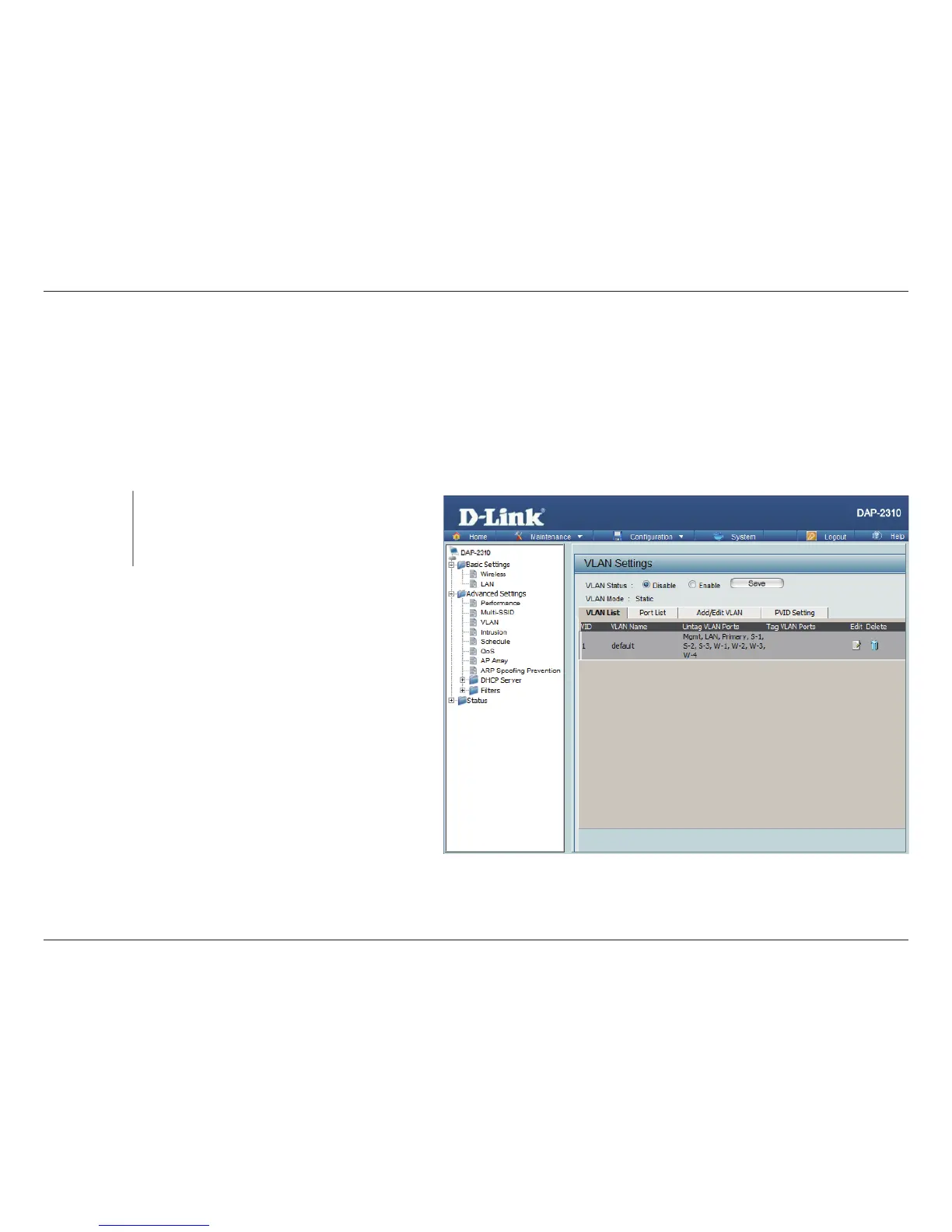 The DAP-2310 supports VLANs. VLANs can be created with a Name and VID. Mgmt (TCP stack), LAN, Primary Multiple SSID, and