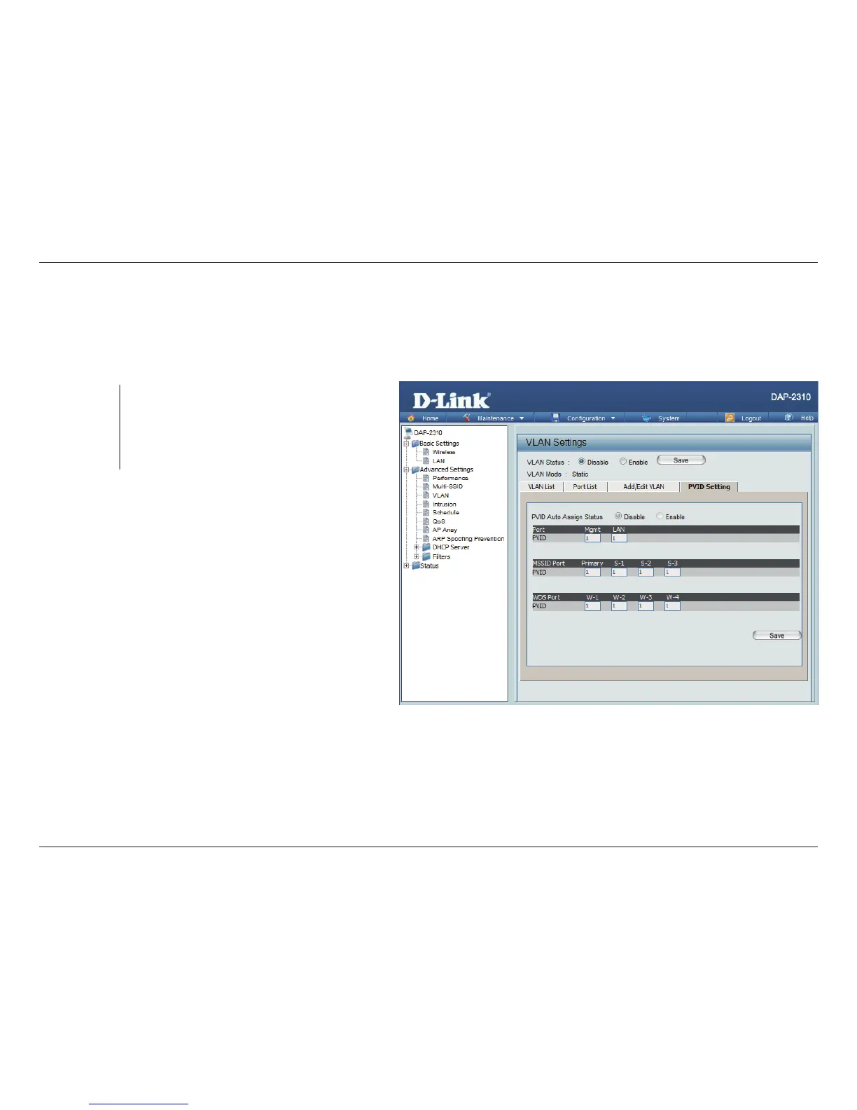 The PVID Setting tab is used to enable/disable the Port VLAN Identier Auto Assign Status as well as to congure various types