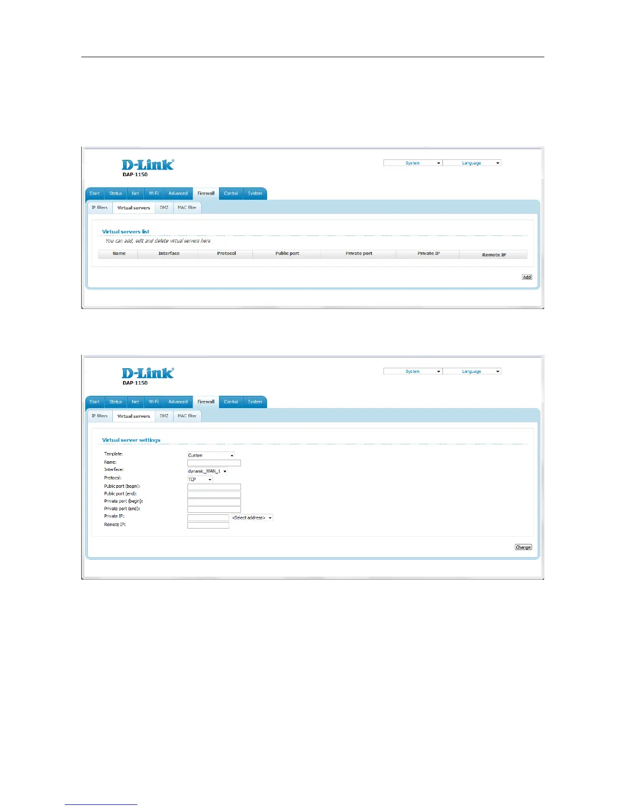 Figure 140. The Firewall / Virtual servers page.