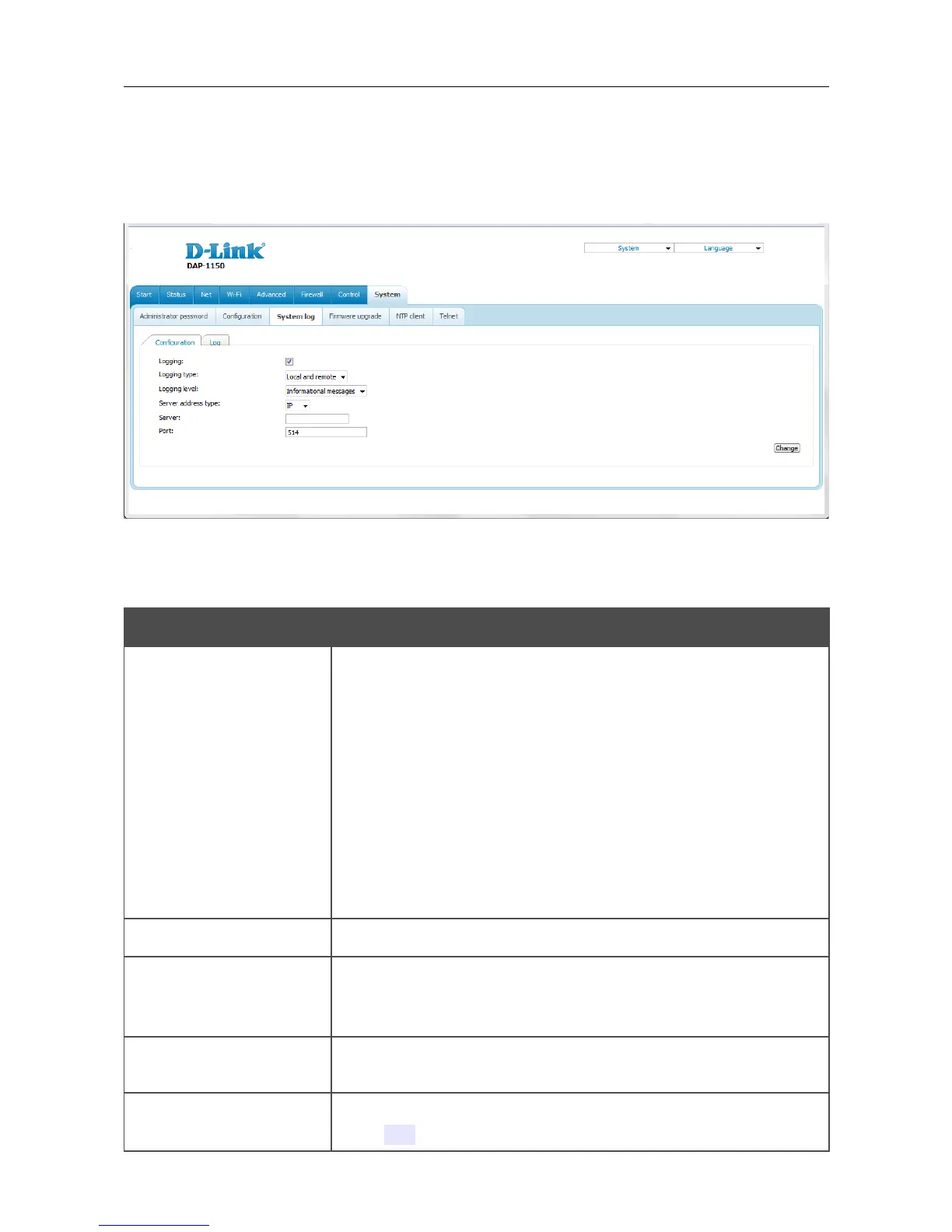 On the System / System log page, you can set the system log options and configure sending the