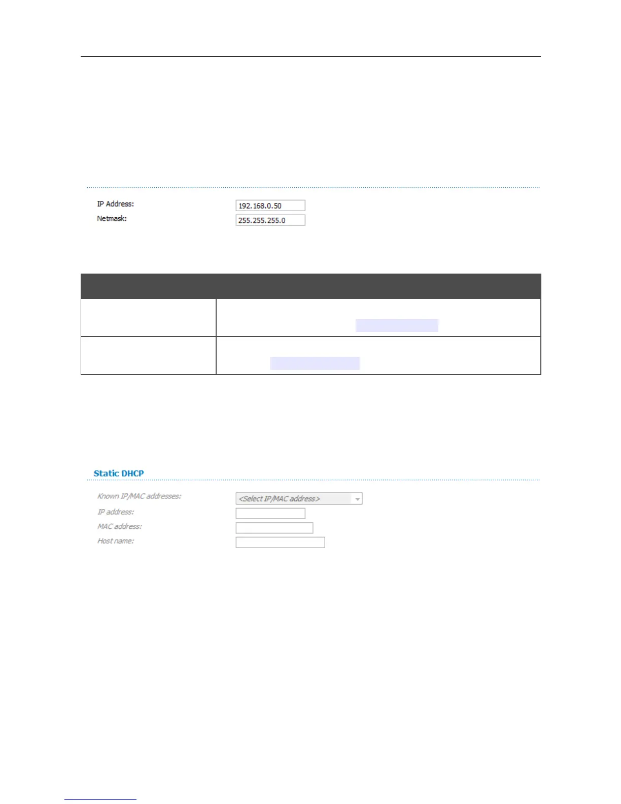 In the Static DHCP section, you can specify MAC address and IP address pairs (set a fixed IP