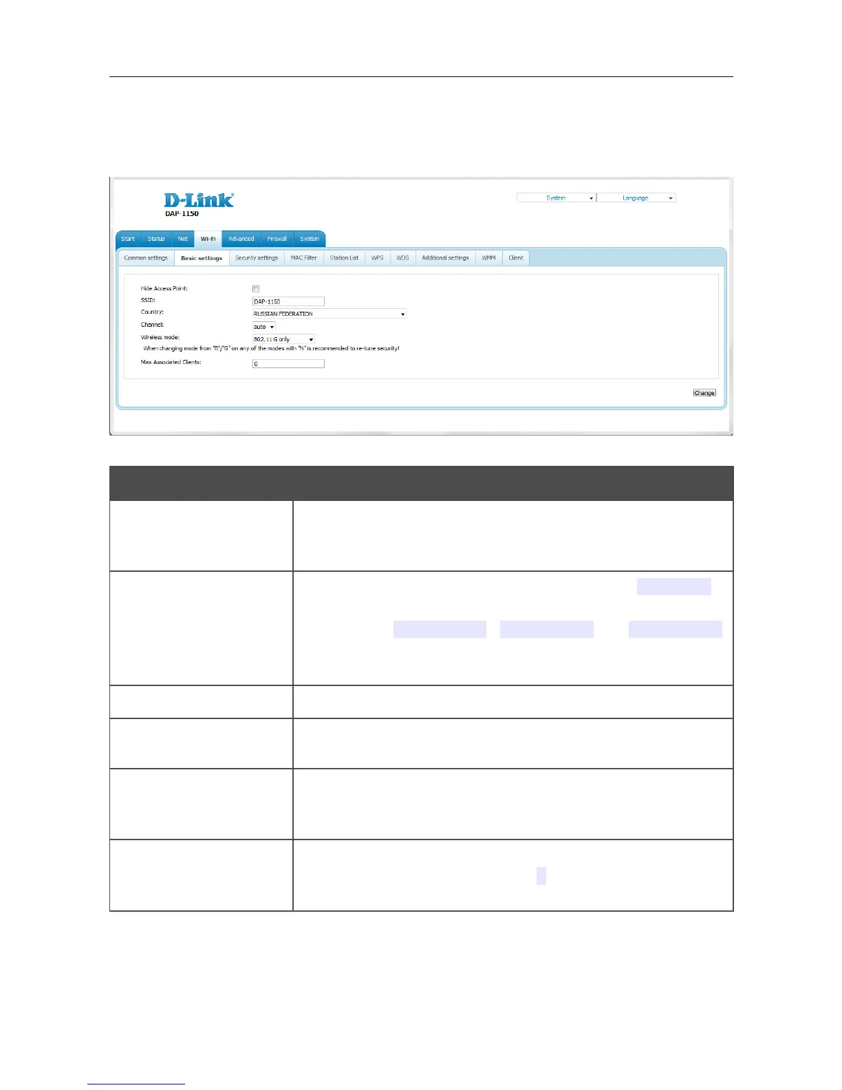 On the Wi-Fi / Basic settings page, you can configure basic parameters of the device's WLAN.