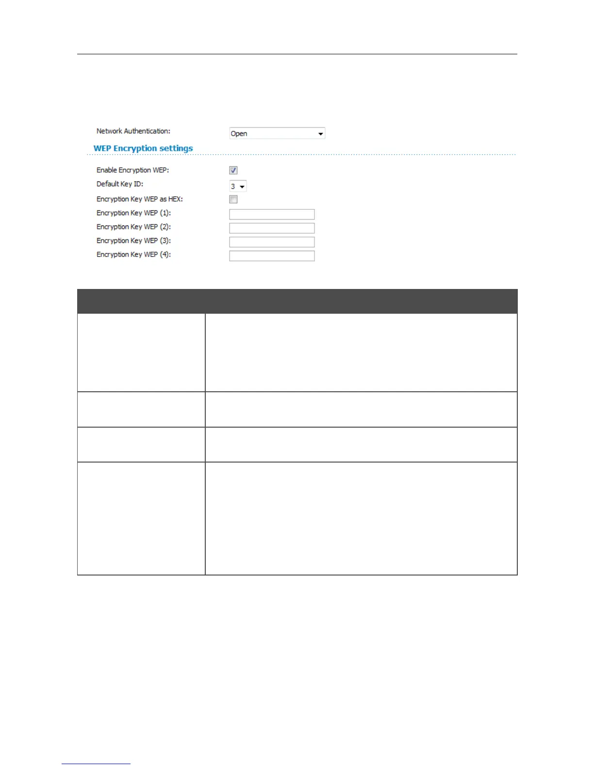 When the Open or Shared value is selected, the WEP Encryption settings section is displayed