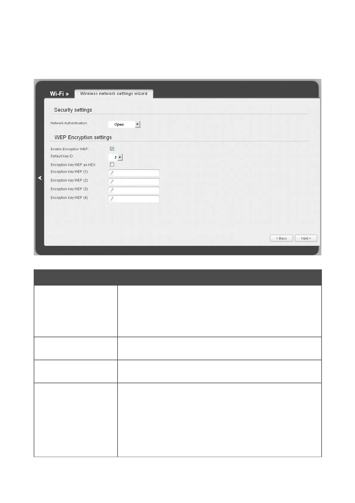 When the Open or Shared value is selected, the WEP Encryption settings section is displayed
