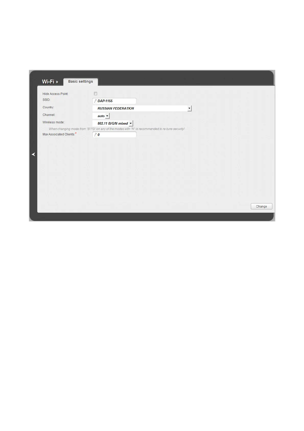 On the Wi-Fi / Basic settings page, you can configure basic parameters of the device's WLAN.
