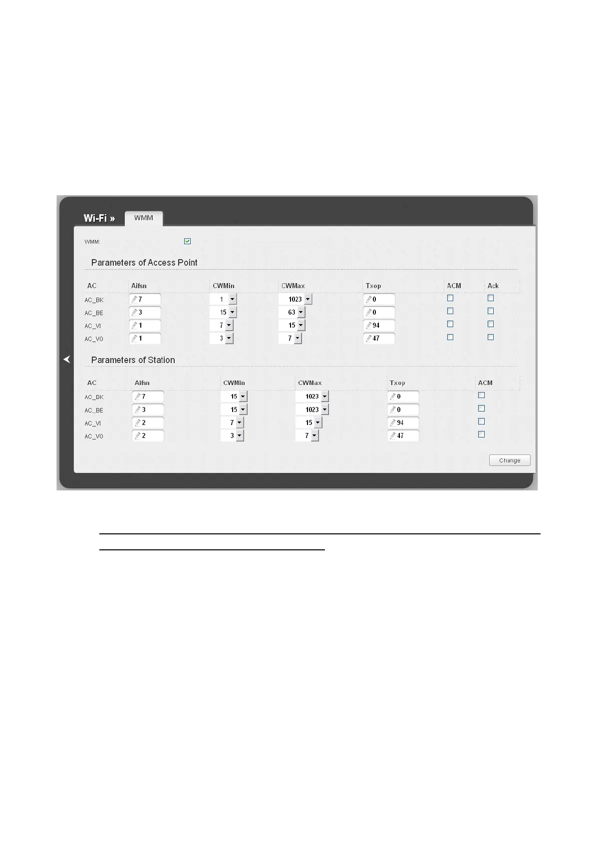 To enable the function, select the WMM checkbox and click the Change button.