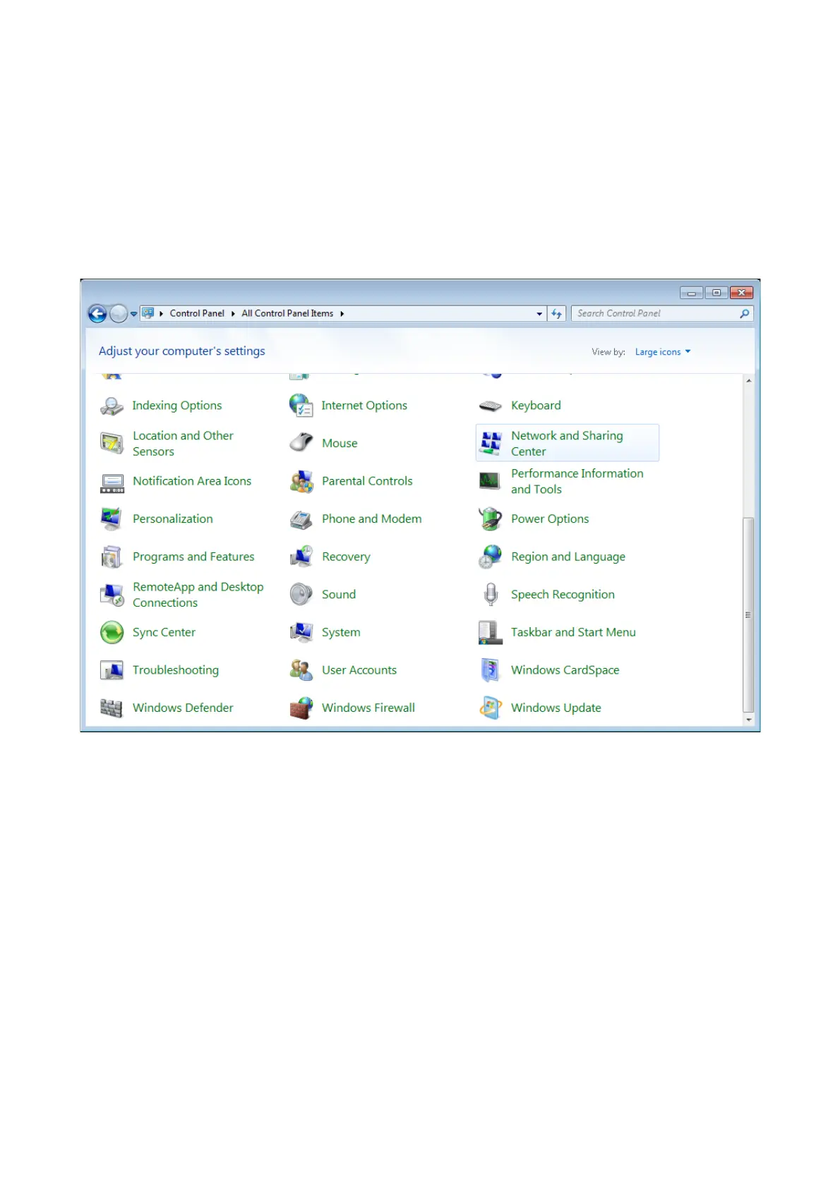 2. Select the Network and Sharing Center section. (If the Control Panel has the category