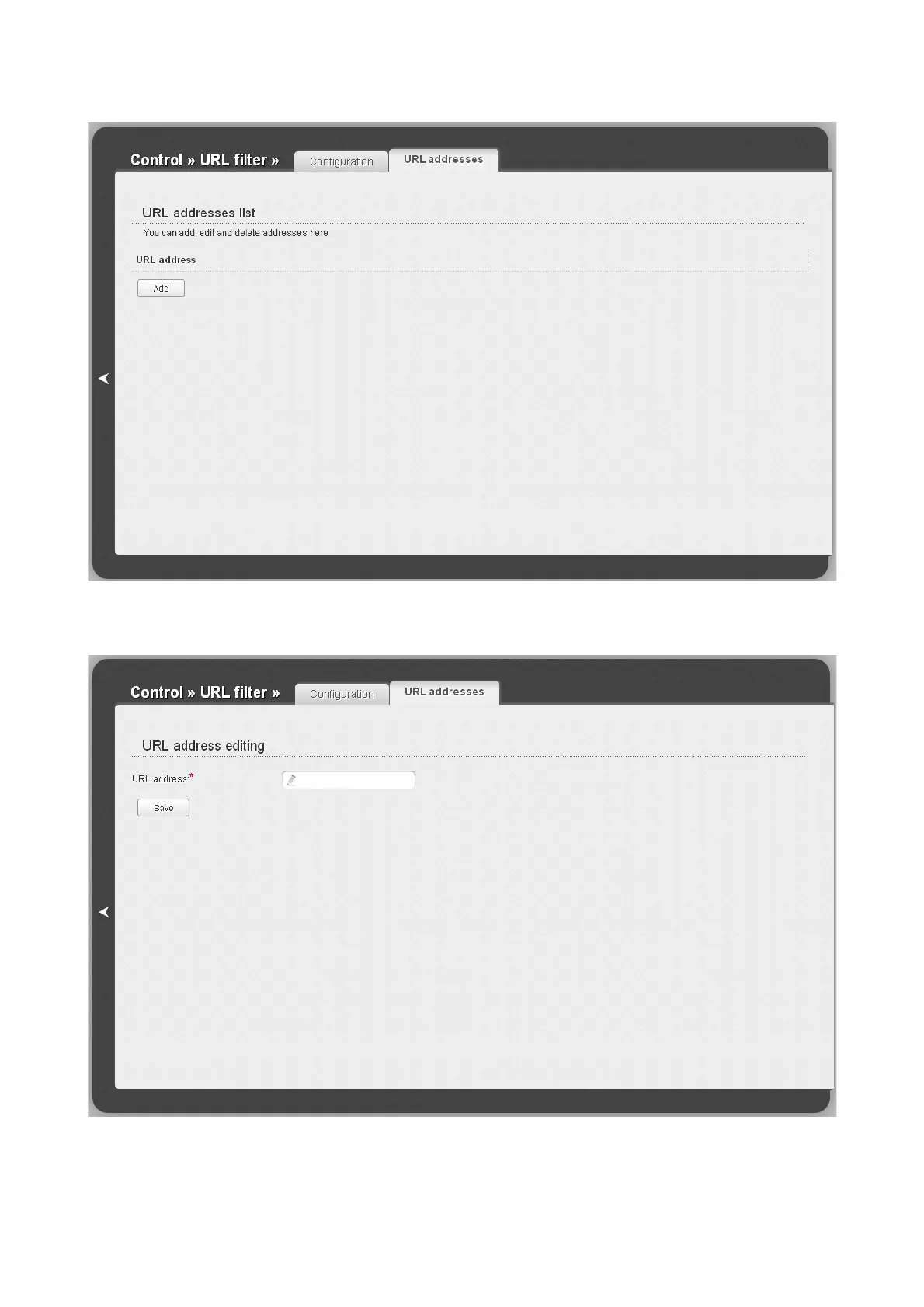 Figure 154. The Control / URL filter page. The URL addresses tab.