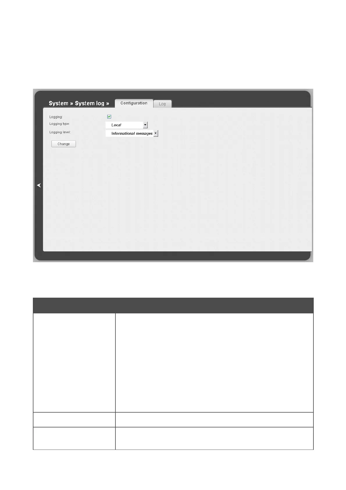 Figure 158. The System / System log page. The Configuration tab.
