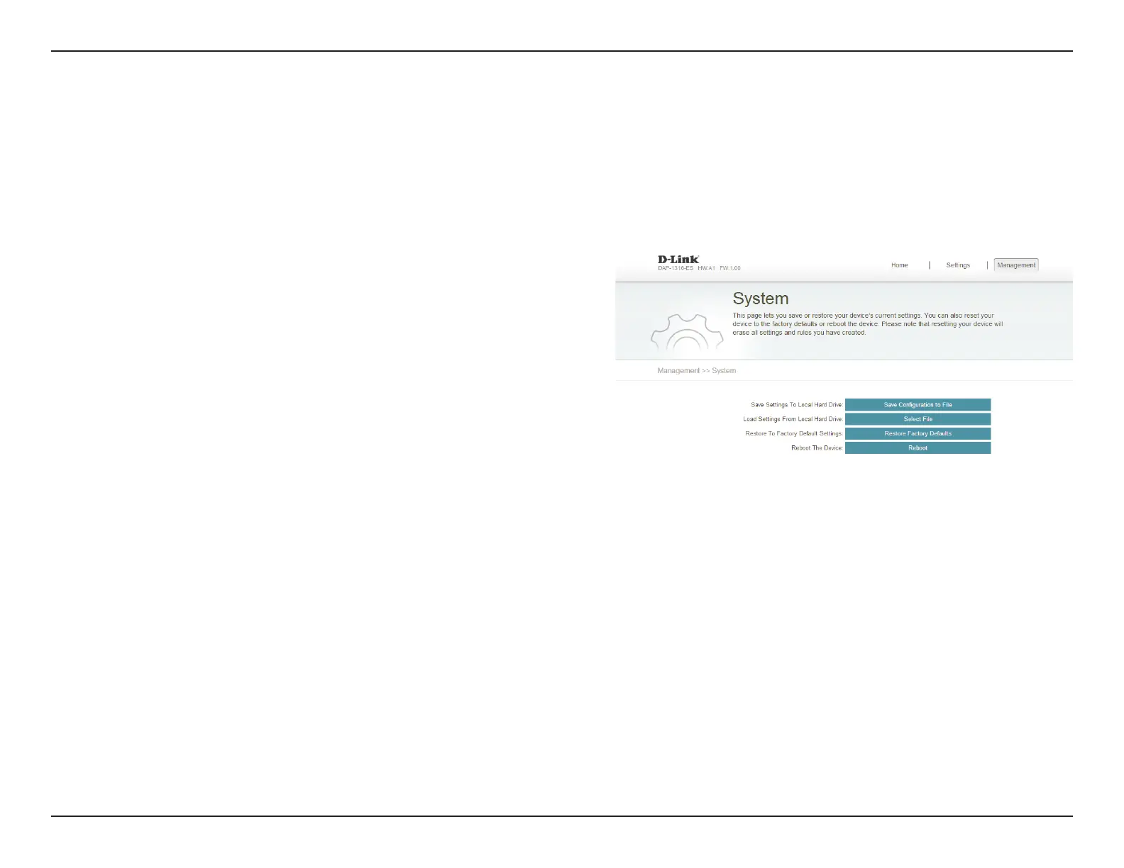 This page allows you to save or restore your system conguration, reset or reboot the DAP-1316-ES. To access this page, click