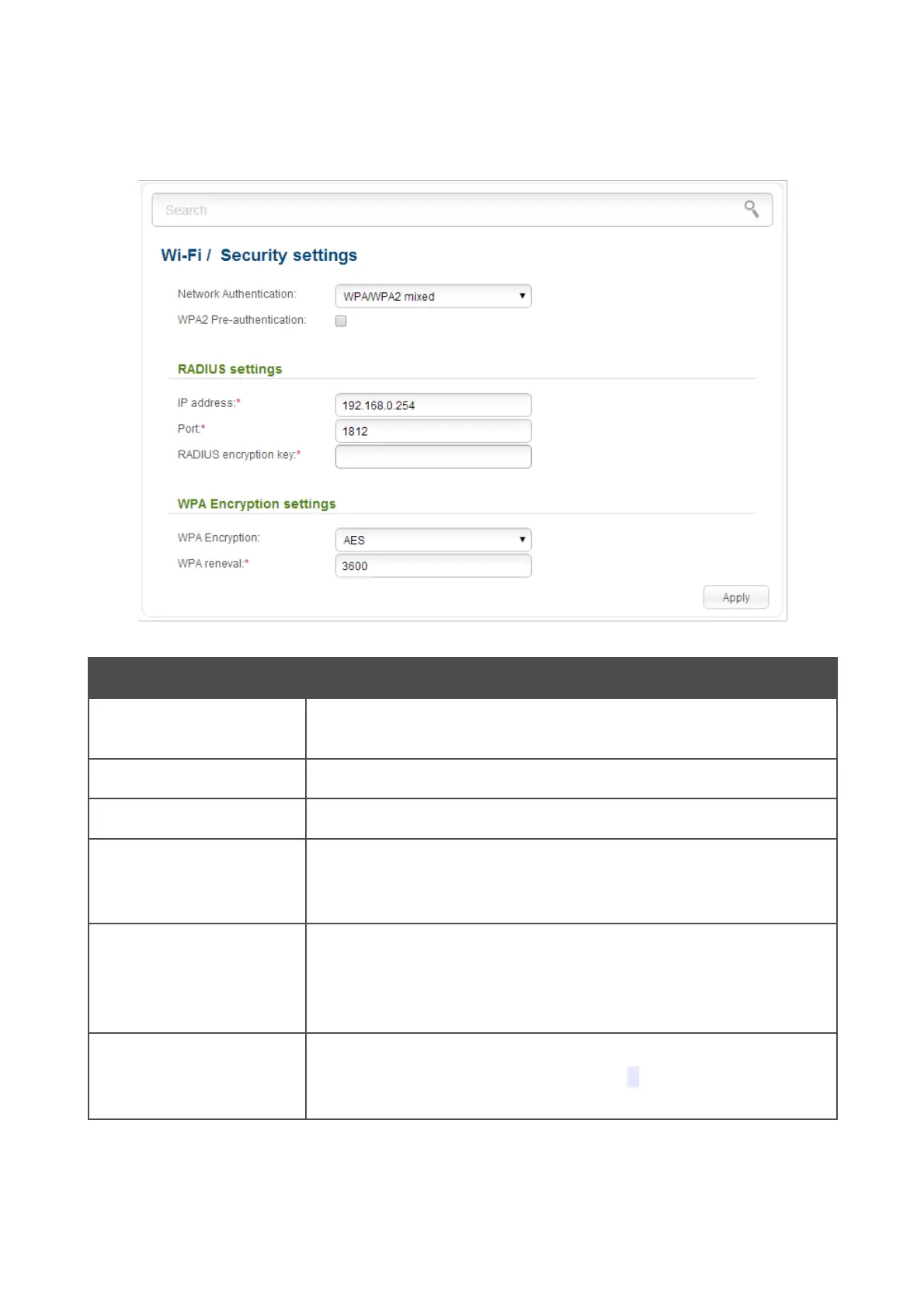 When the WPA, WPA2, or WPA/WPA2 mixed value is selected, the RADIUS settings and