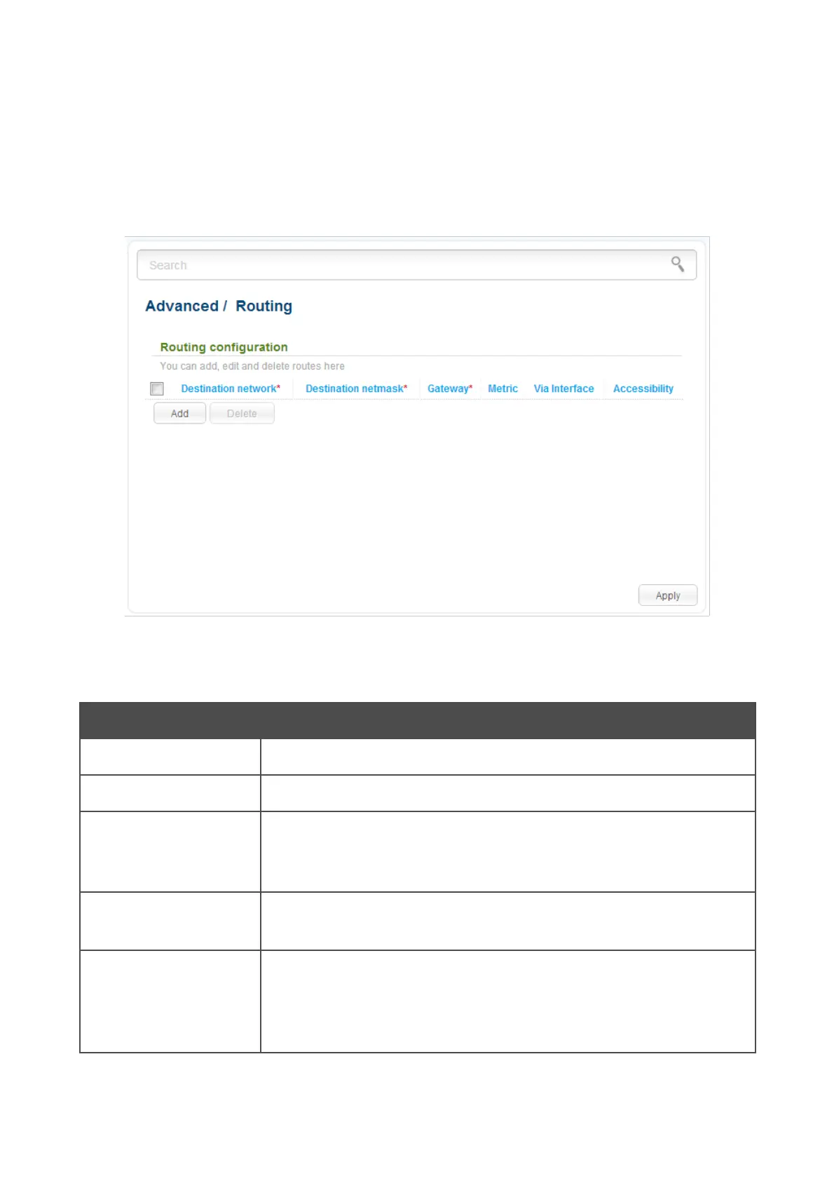 To create a new route, click the Add button. In the line displayed, you can specify the following