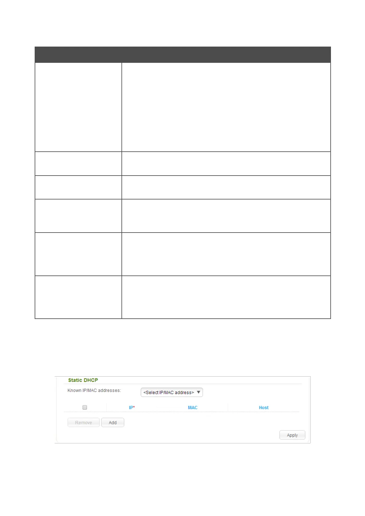 In the Static DHCP section, you can specify MAC address and IP address pairs (set a fixed IP